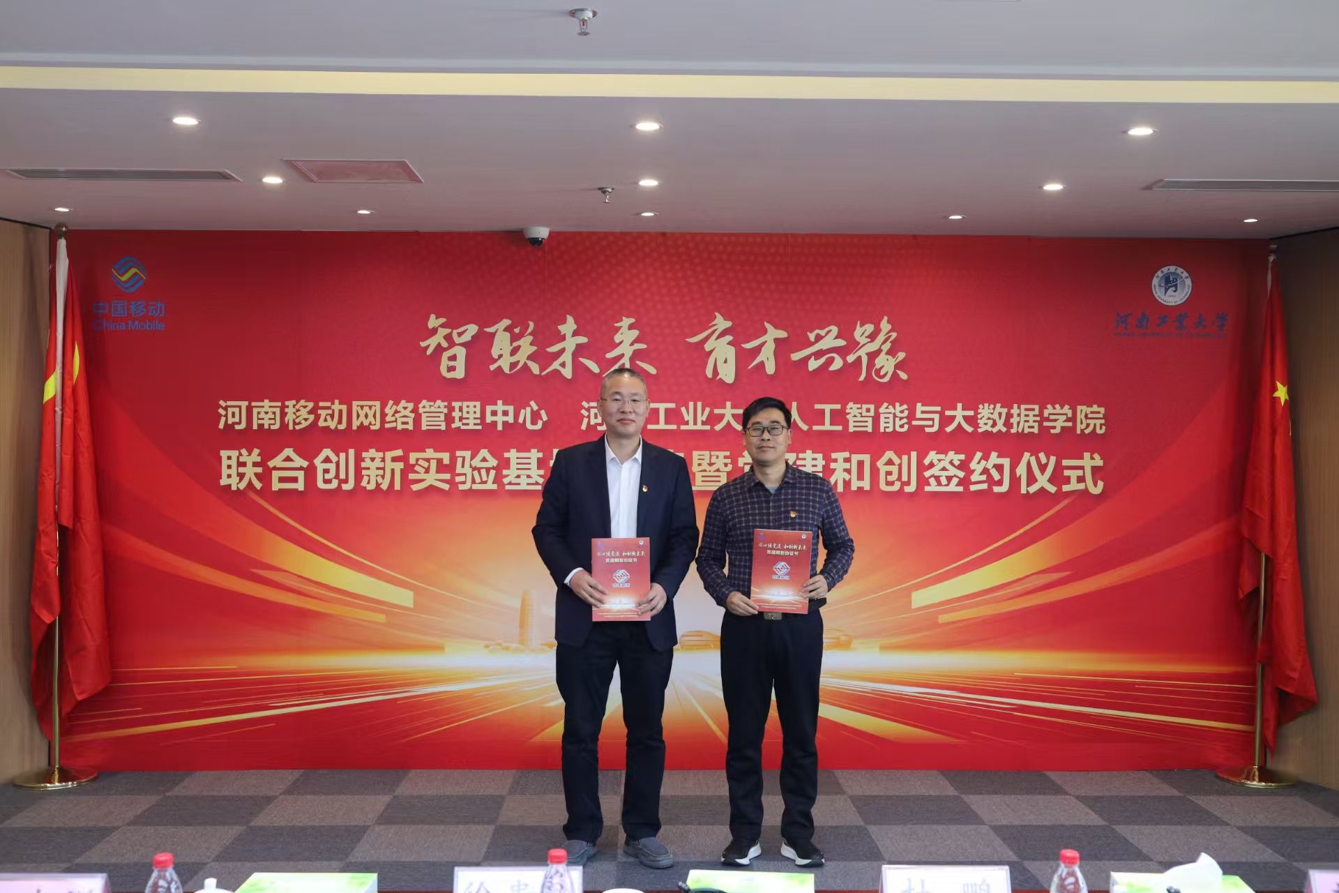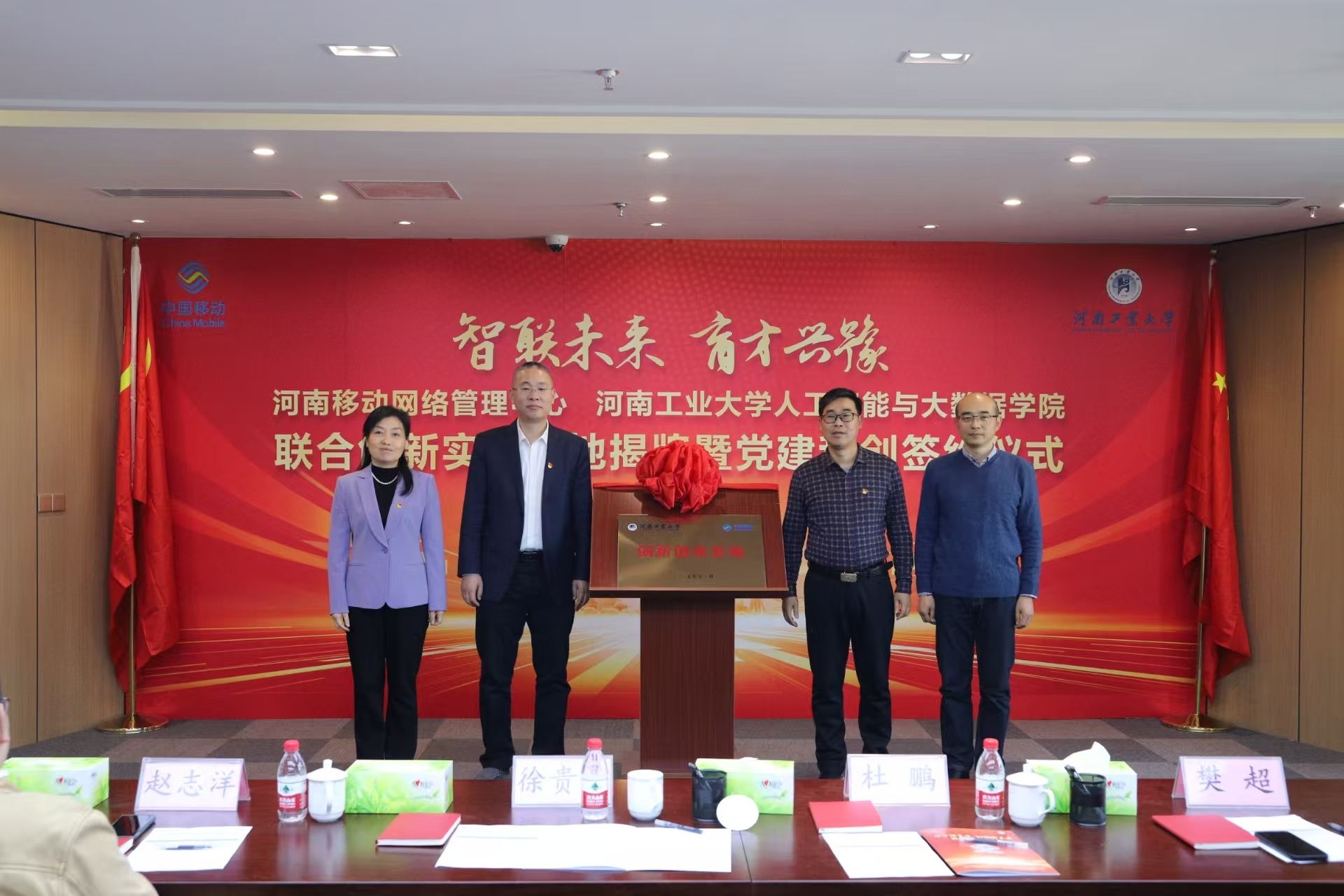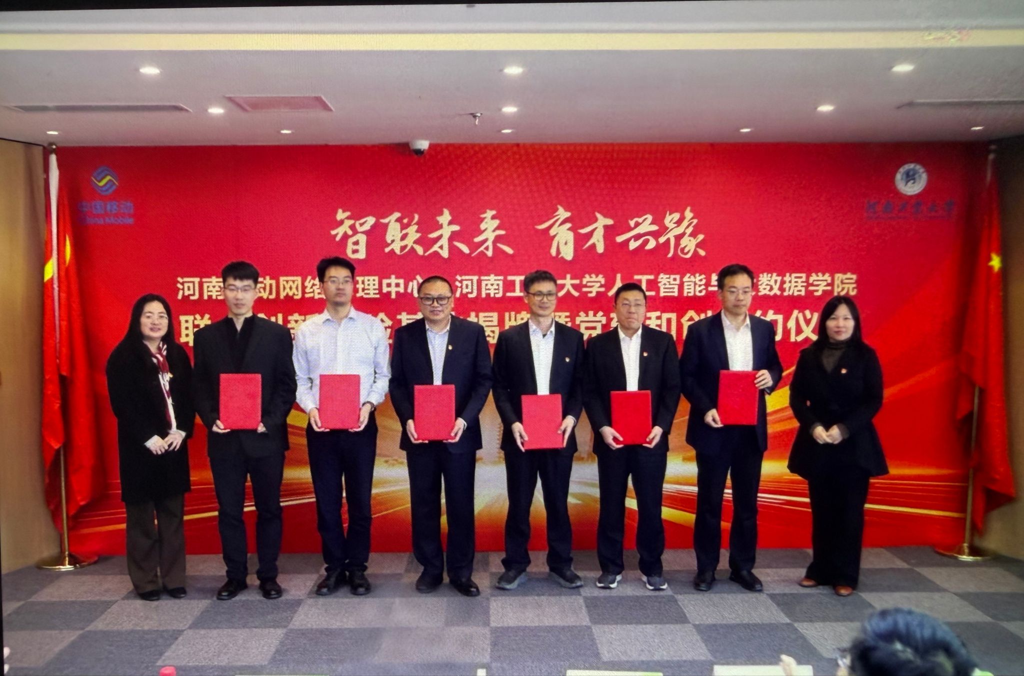 11月25日,在中国移动中部智算中心,我校人工智能与大数据学院与中国移动河南有限公司、华为技术有限公司共同组建的“联合创新实验基地”揭牌成立,同时学院党委与河南移动网络管理中心党总支签署党建和创协议,开启党建引领产教融合的校企合作新模式。学院领导班子和河南移动、华为河南代表处的主要负责人出席了揭牌签约活动。