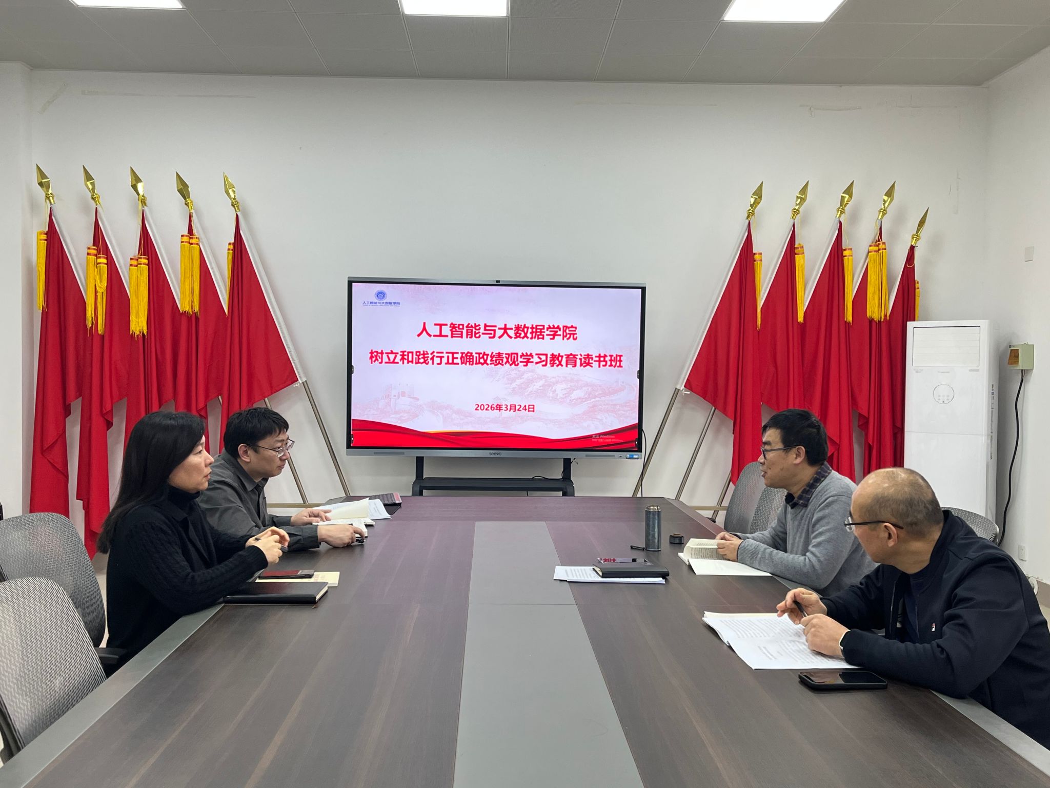 为深入学习贯彻习近平总书记关于树立和践行正确政绩观的重要论述,切实把思想和行动统一到党中央决策部署及学校党委工作要求上来,3月24日至25日,人工智能与大数据学院在6369会议室举办树立和践行正确政绩观学习教育读书班。学院党委理论学习中心组成员参加学习。