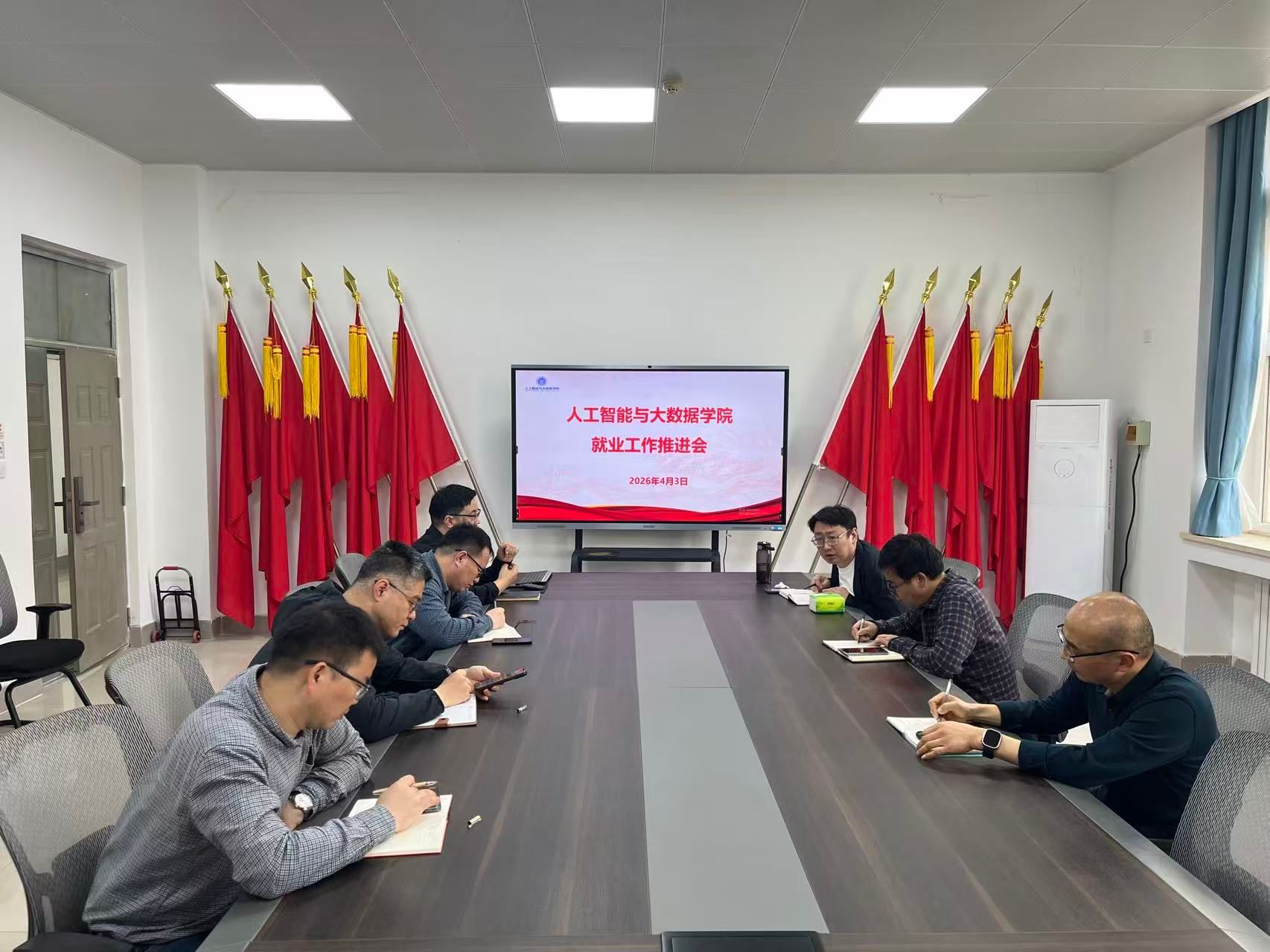 为扎实做好 2026 届毕业生就业工作,精准对接就业需求、全力推进考研调剂服务,4月3日,人工智能与大数据学院在6371会议室,召开就业工作推进会。学院党委书记杜鹏、院长樊超、党委副书记赵志洋及各科室负责人、各系主任参加会议。